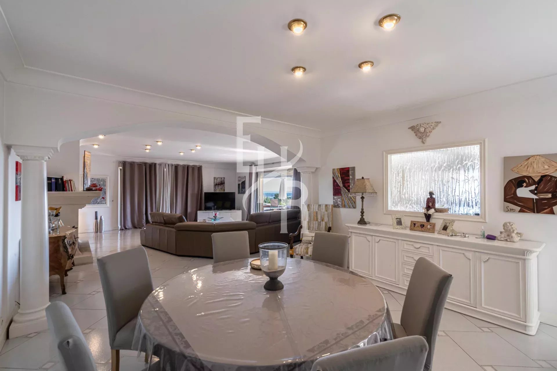 Kauf/Verkauf Villa mit Meerblick auf das Cap d'Antibes und die Bucht von Juan les Pins. Riesige hochwertige Villa von 300 m² in einer ruhigen Wohngegend, sehr geräumiges Wohnzimmer mit Kamin, Esszimmer, Veranda, Einbauküche, 4 Schlafzimmer mit Badezimmern und Ankleideräumen, darunter eine Master-Suite auf einer Ebene und ein großes Badezimmer. Billard zimmer.