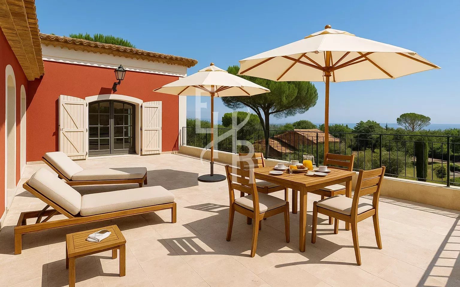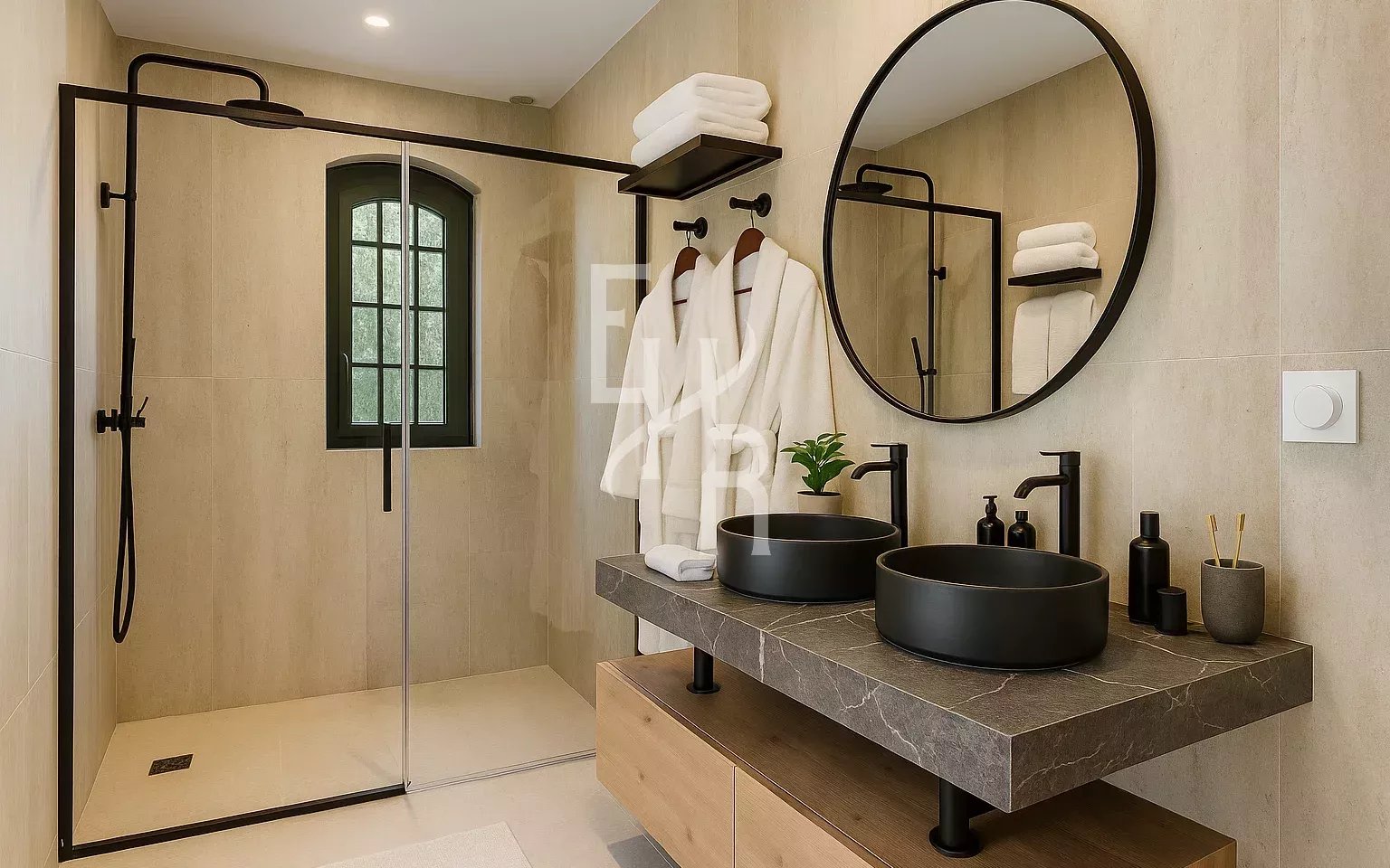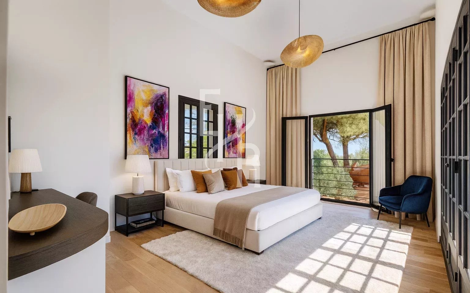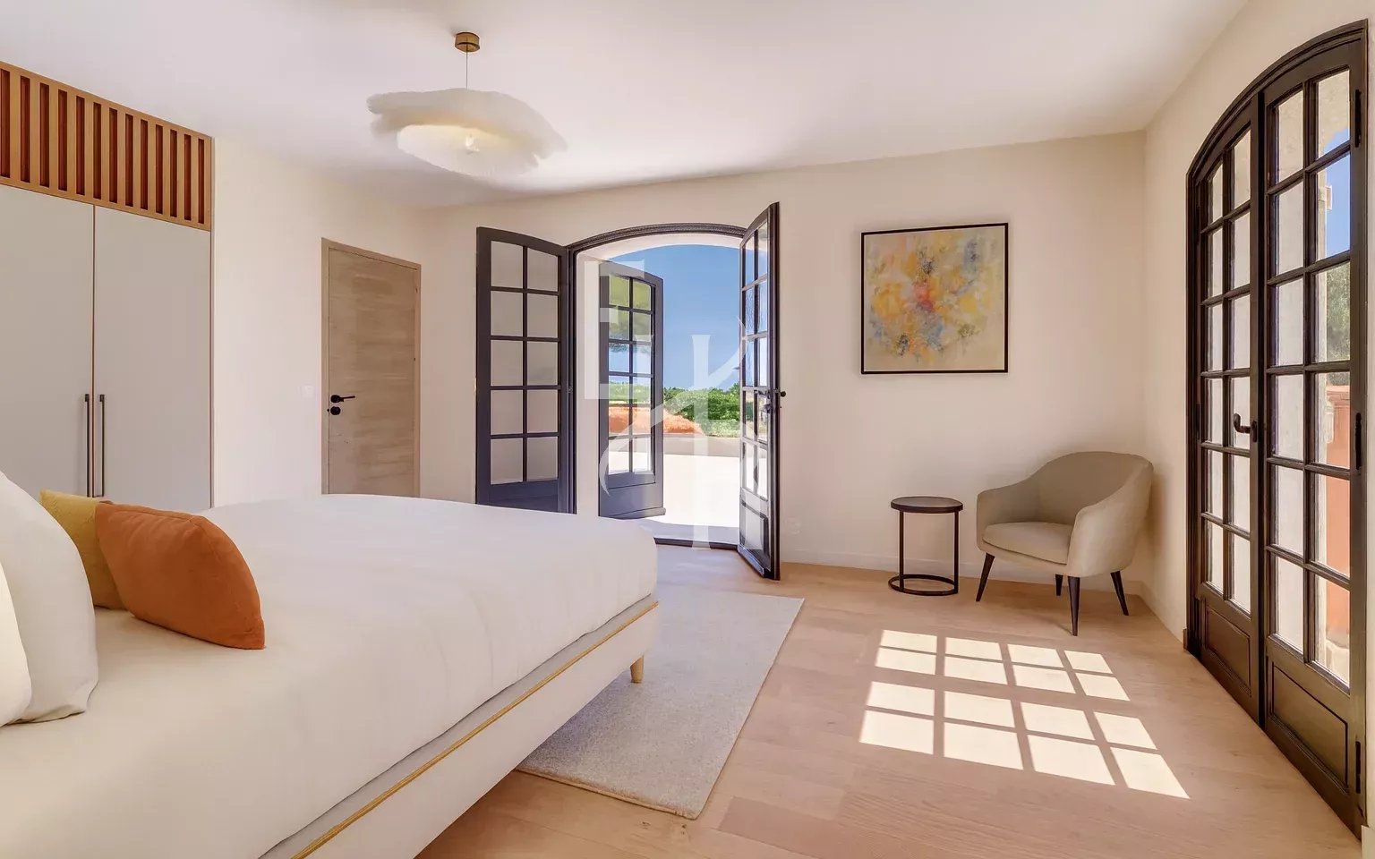 L'étage abrite deux chambres supplémentaires, chacune avec sa salle de bains, dont une magnifique chambre de maitre avec dressing, salle de bains et grande terrasse privative offrant une belle vue dégagée.